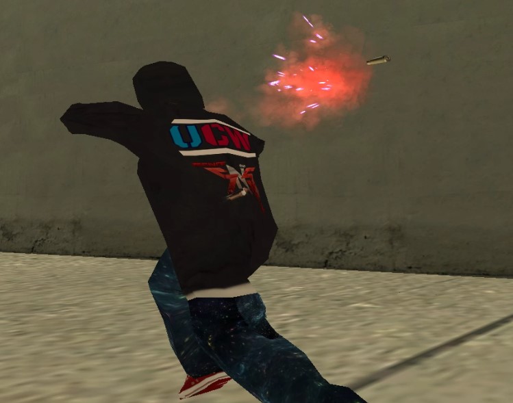 | This mod adds realistic red smoke effects when firing weapons in Grand Theft Auto: San Andreas, enhancing immersion with visuals after each shot. |